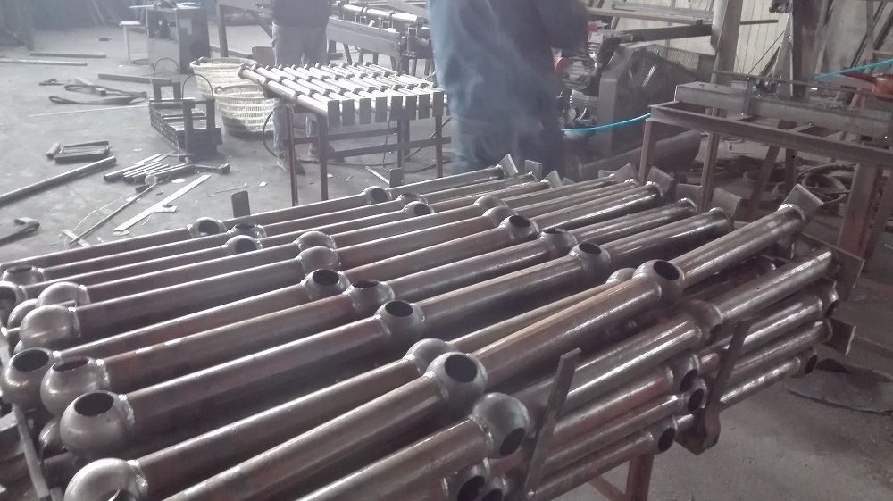 3)、穿入欄桿管件至第一根立柱半個(gè)球位,其余部分懸空。